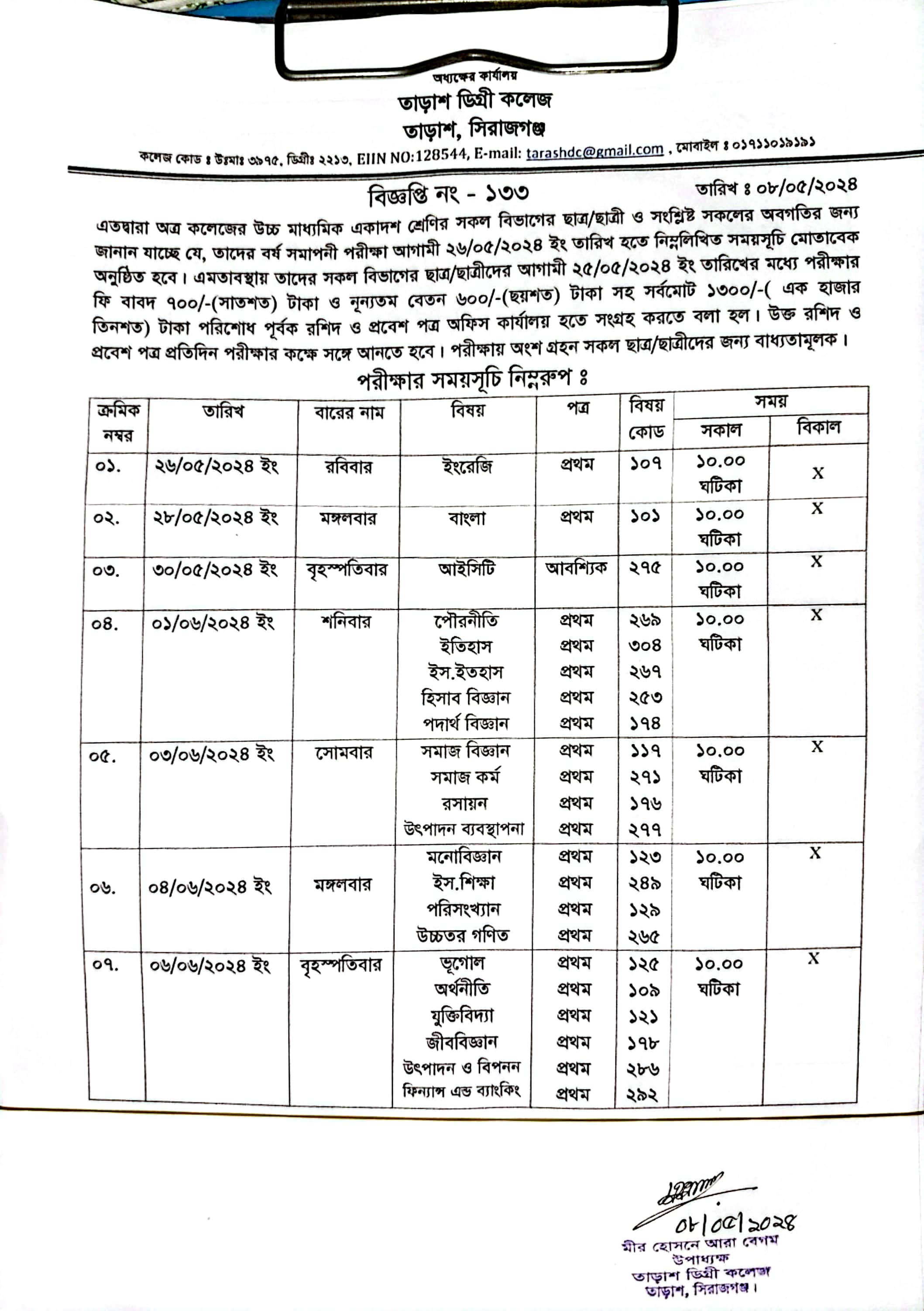 একাদশ শ্রেনীর বর্ষ সমাপনী পরীক্ষার রুটিন ২০২৪