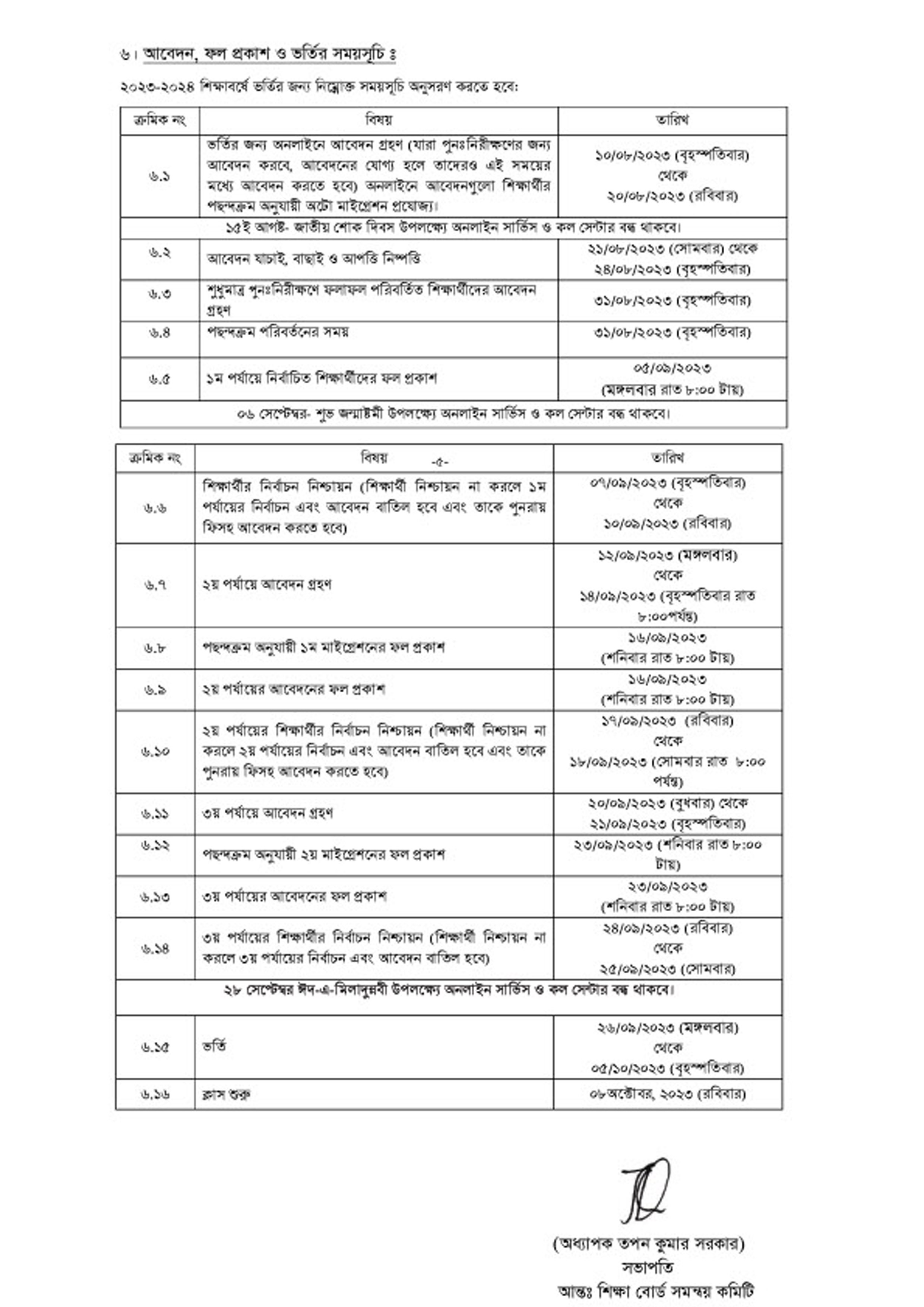 2023-24 শিক্ষাবর্ষের ভর্তির আবেদন ও ফলােফলের তারিখ