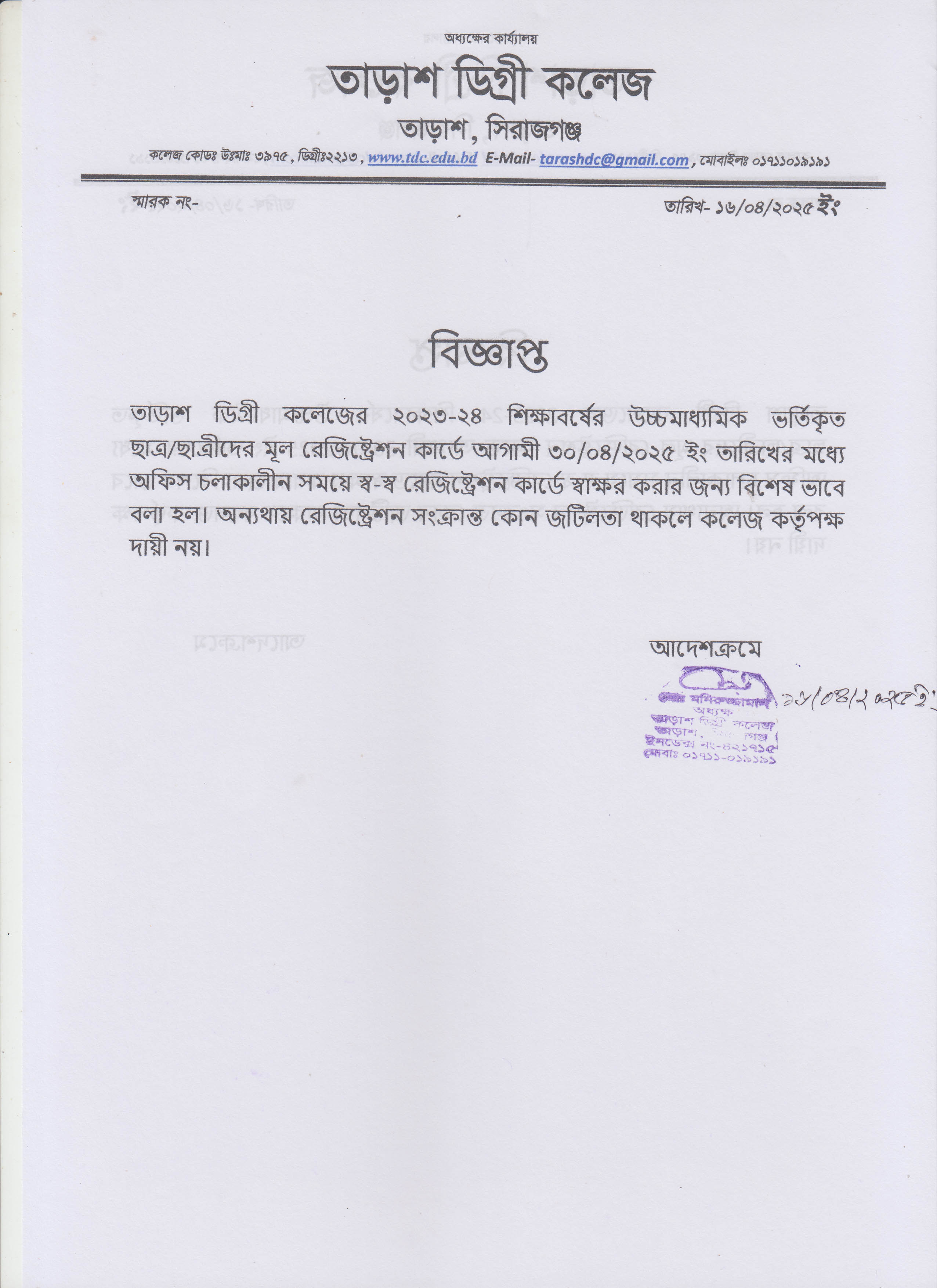 তাড়াশ ডিগ্রী কলেজের 2023-24 শিক্ষাবর্ষের উচ্চমাধ্যমিক ভর্তিকৃত ছাত্র/ছাত্রীদের মূল রেজিষ্ট্রেশন কার্ডে আগামী 30/04/2025 ইং তারিখের মধ্যে অফিস চলাকালীন সময়ে স্ব-স্ব রেজিষ্ট্রেশন কার্ডে স্বাক্ষর করার জন্য বিশেষ ভাবে বলা হল। অন্যথায় রেজিষ্ট্রেশন সংক্রান্ত কোন জটিলতা থাকলে কলেজ কর্তৃপক্ষ দায়ী নয়।