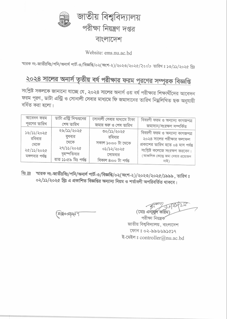 ২০২৪ সালের অনার্স তৃতীয় বর্ষ ফরম পূরণের সম্পূরক বিজ্ঞপ্তি